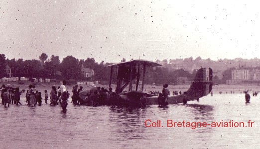 Ces deux photographies, prises à quelques minutes d'intervalle à Morgat en presqu'île de Crozon au milieu des années 1930, montrent un hydravion école FBA 17 HE2 de la Section d'entraînement et de servitude de Brest.